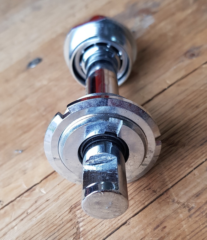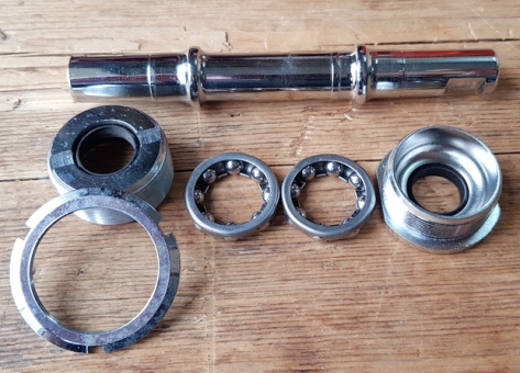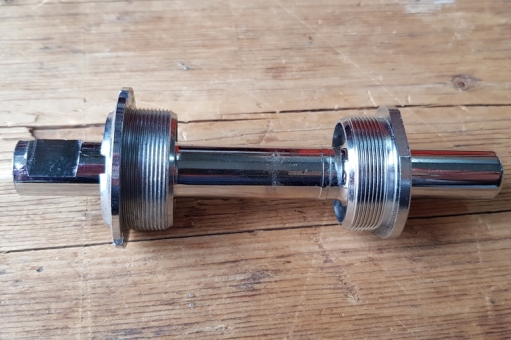 Tourensporträder mit Keilachse, komplett mit Schalen, Achse (ca. 139.5 mm, s. Bild) und Kugelringen, Kettenblattseite Linksgewinde /
