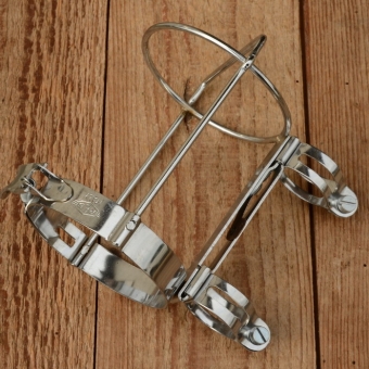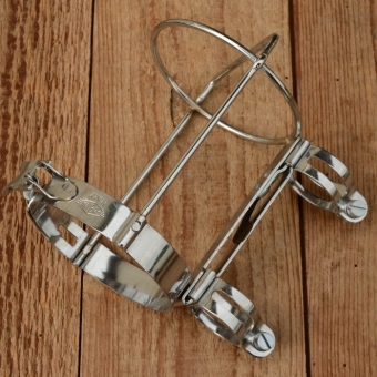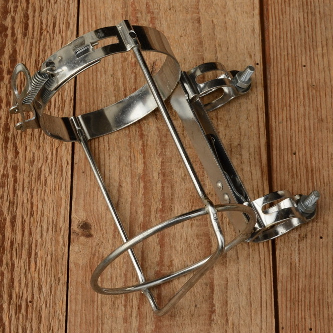Halter für Trinkflasche "REG", verchromt, incl. 2 Schellen u. Spannvorrichtung, rares Originalteil der der 50/60er Jahre. Ideal für sehr hochwertige Rennräder aus dieser Zeit.