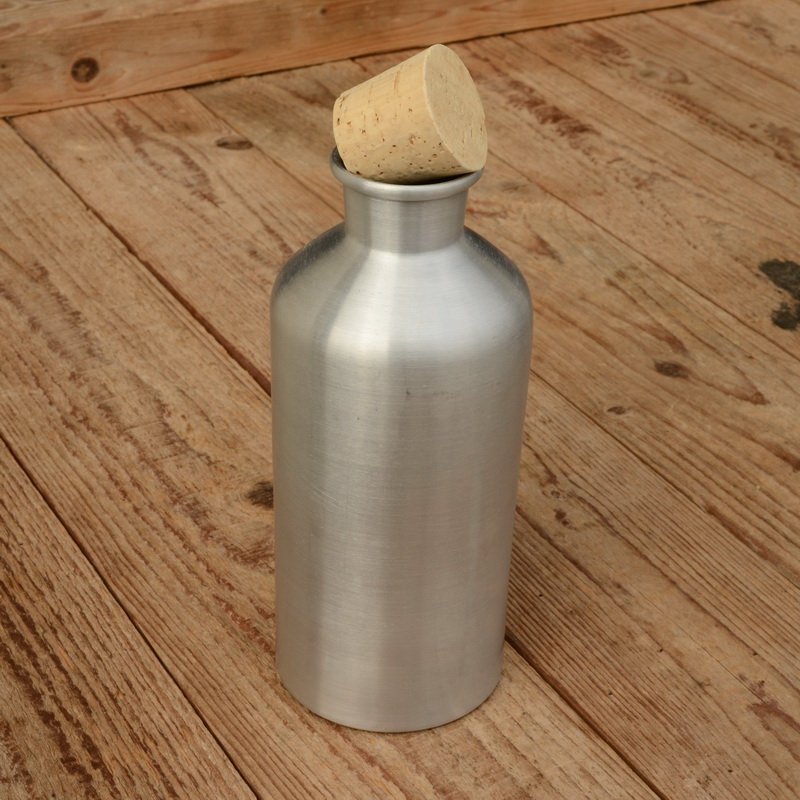 Trinkflasche "ALUMINIUM", unbehandelt, mit Korken, sehr schöne Nachfertigung,hergestellt beim alten deutschen Hersteller, 20-40er Jahre! Ideal für die frühen Klassiker im Rennradbereich, D=74mm, H=185mm